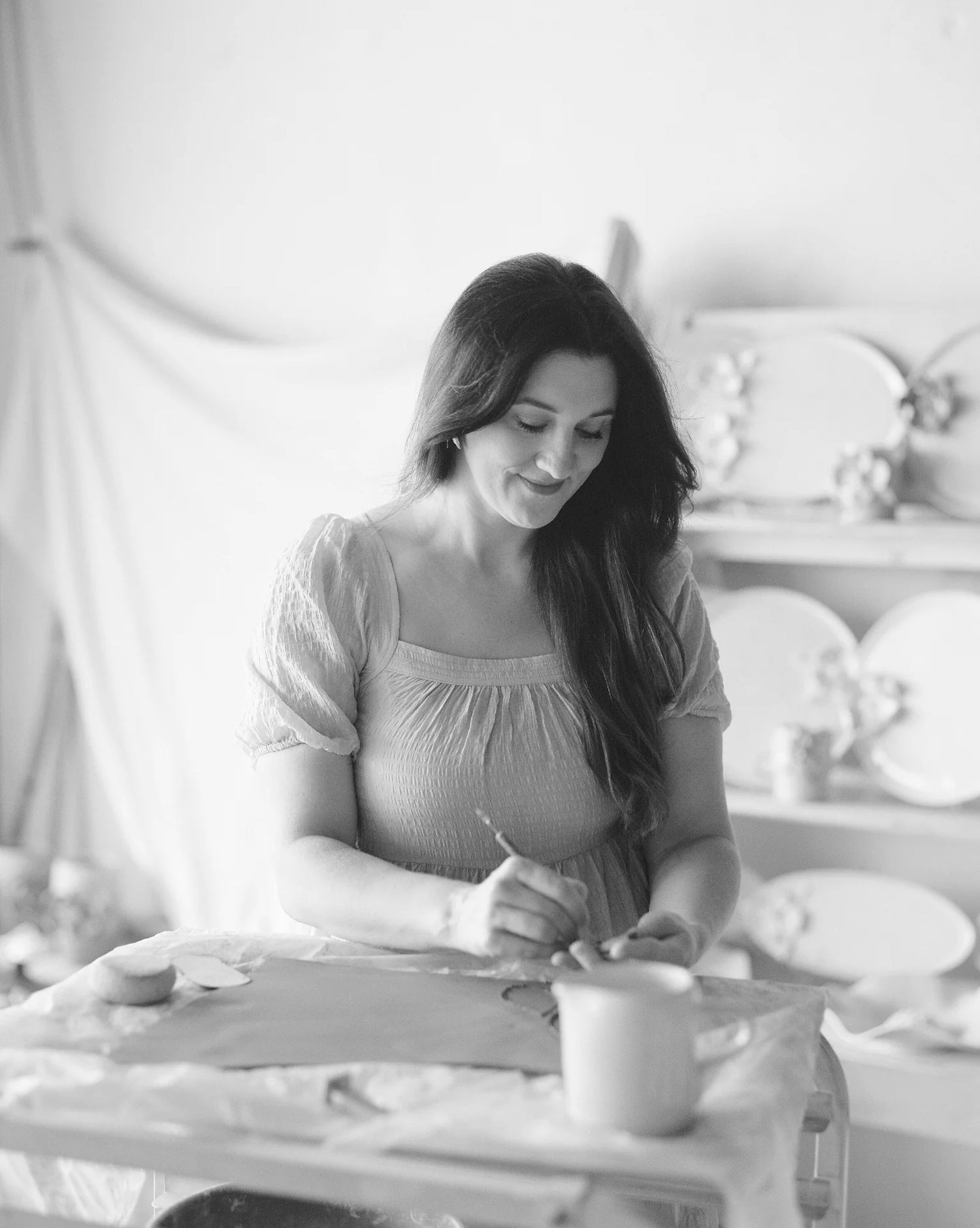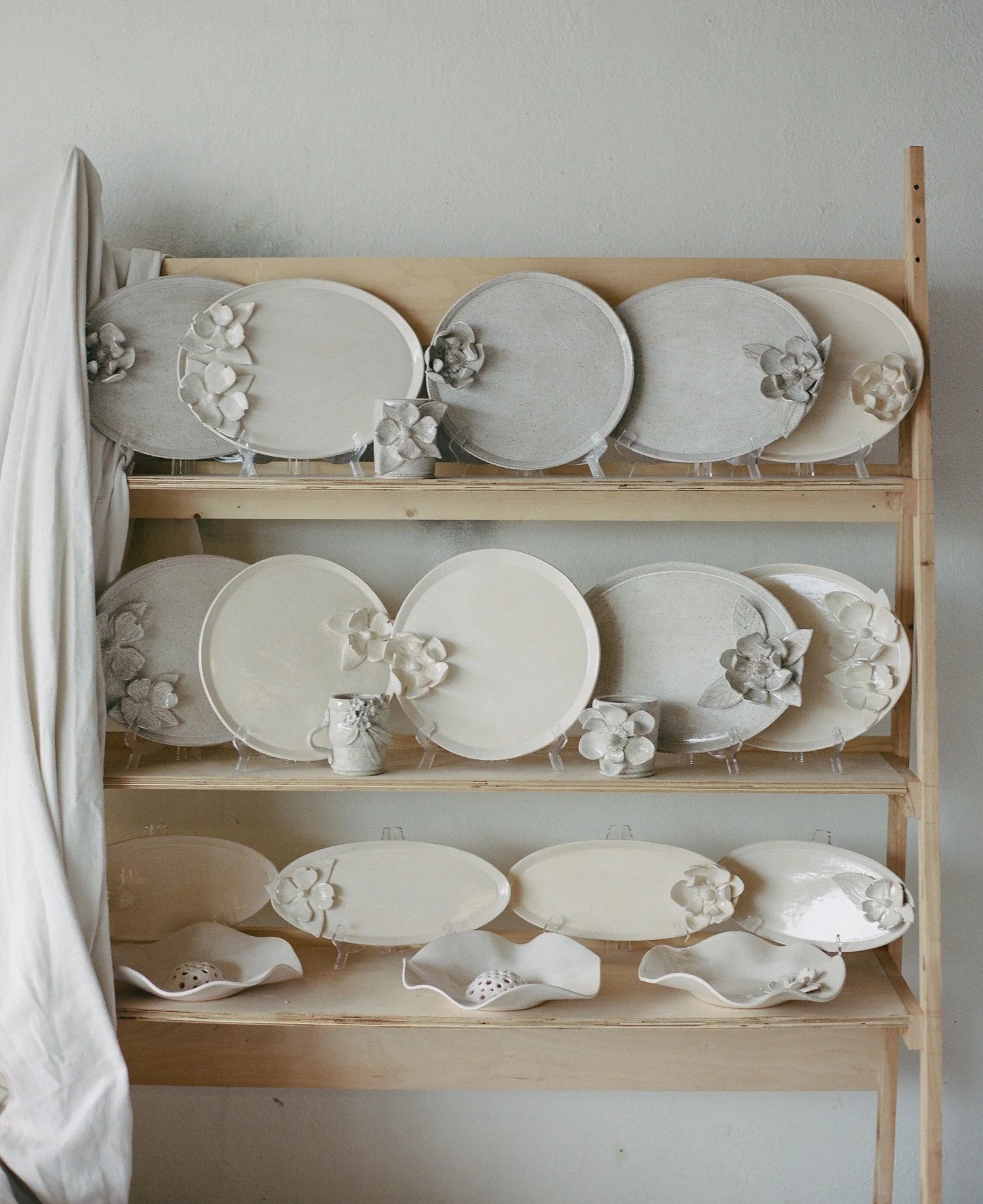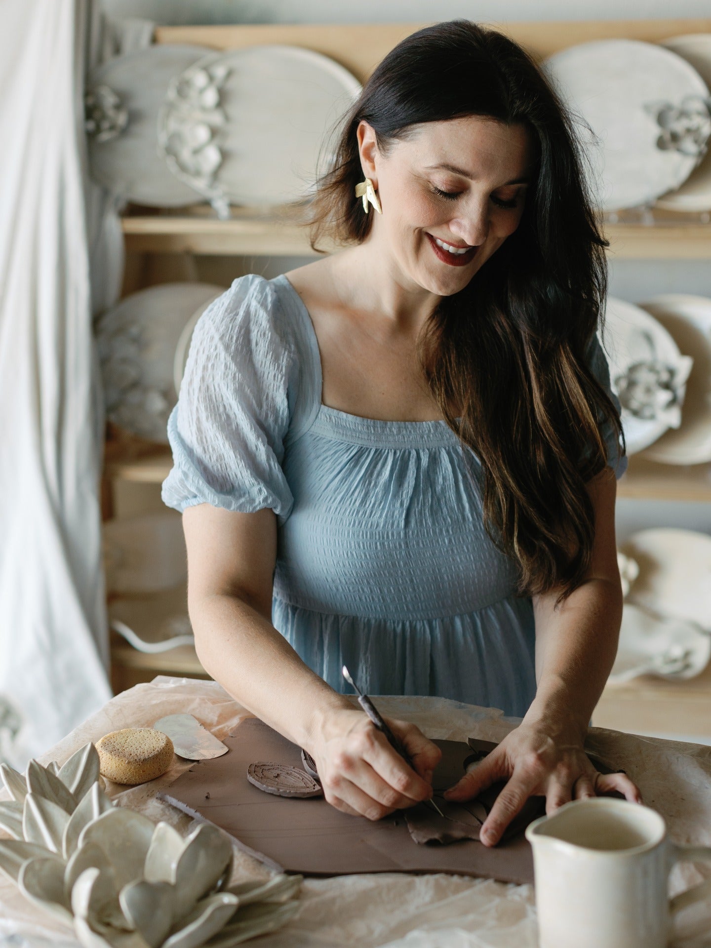 Each peice begins as raw clay that is either rolled into a slab for hand building or wedged and formed to be thrown on the wheel. If it's handbuilt (think magnolias, dogwoods, platters) then each petal is cut by hand and then formed and combined to create the overal look. If it's thrown on the wheel (think vases), then it's centered, and pulled into it's final shape.