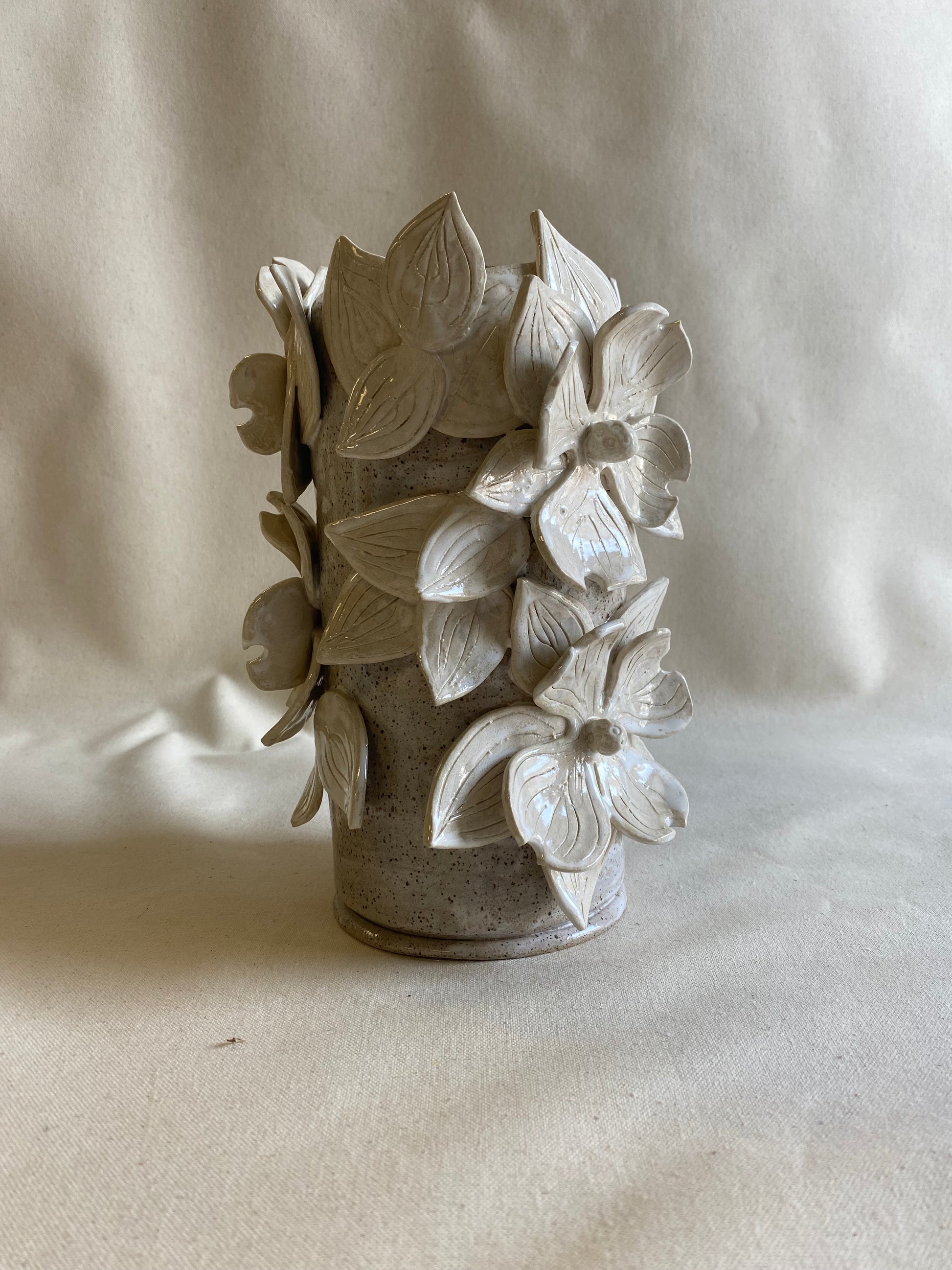This beautiful dogwood vase can be displayed from any angle as it's covered with 6 hand sculpted dogwoods and leaves on a wheel thrown vase. It's truly a work of art and a one of kind piece as it will never be able to be exactly replicated again.