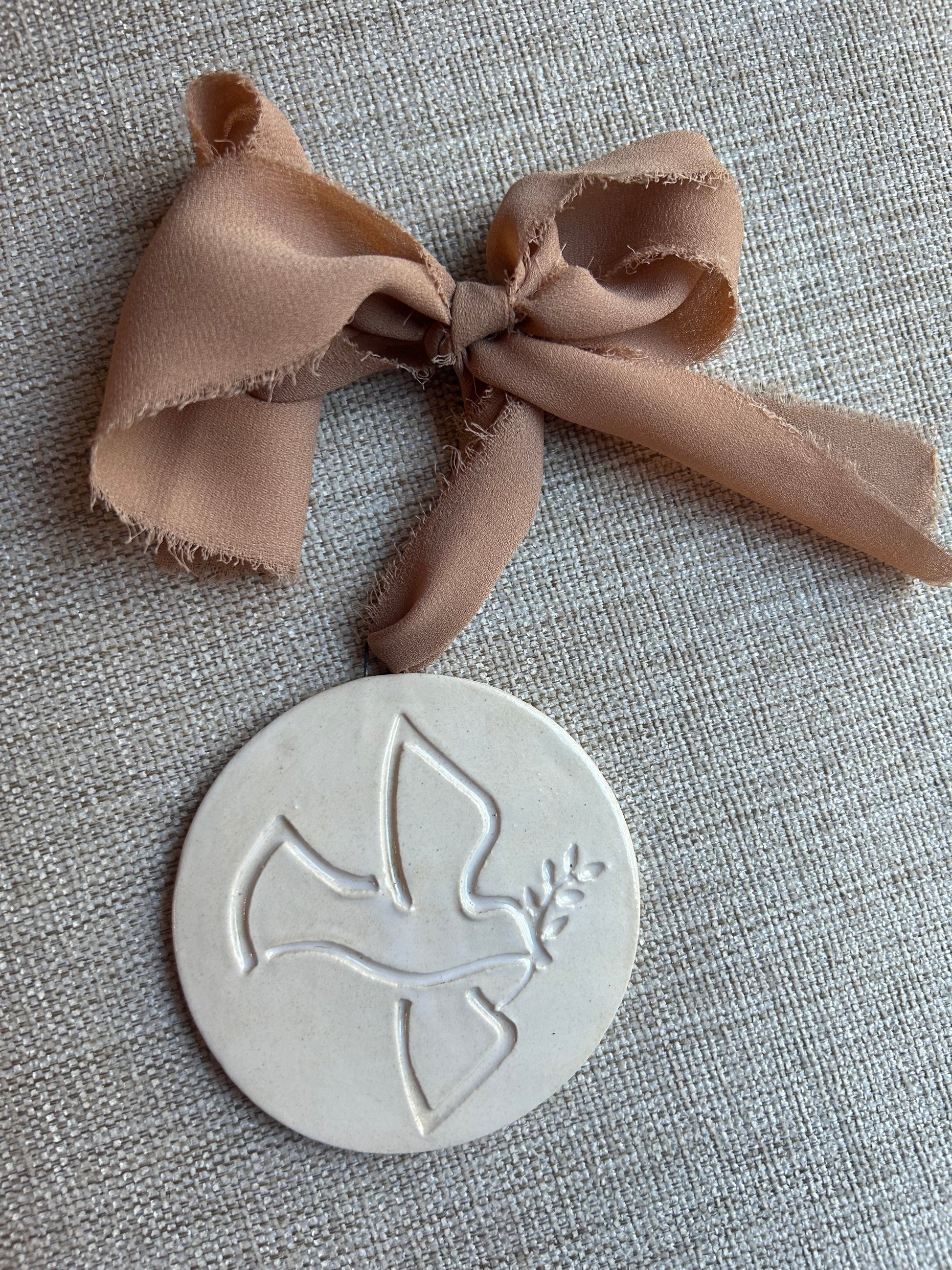 This simple yet beautiful ornament features a deeply engrained dove with an olive branch, symbolizing peace.