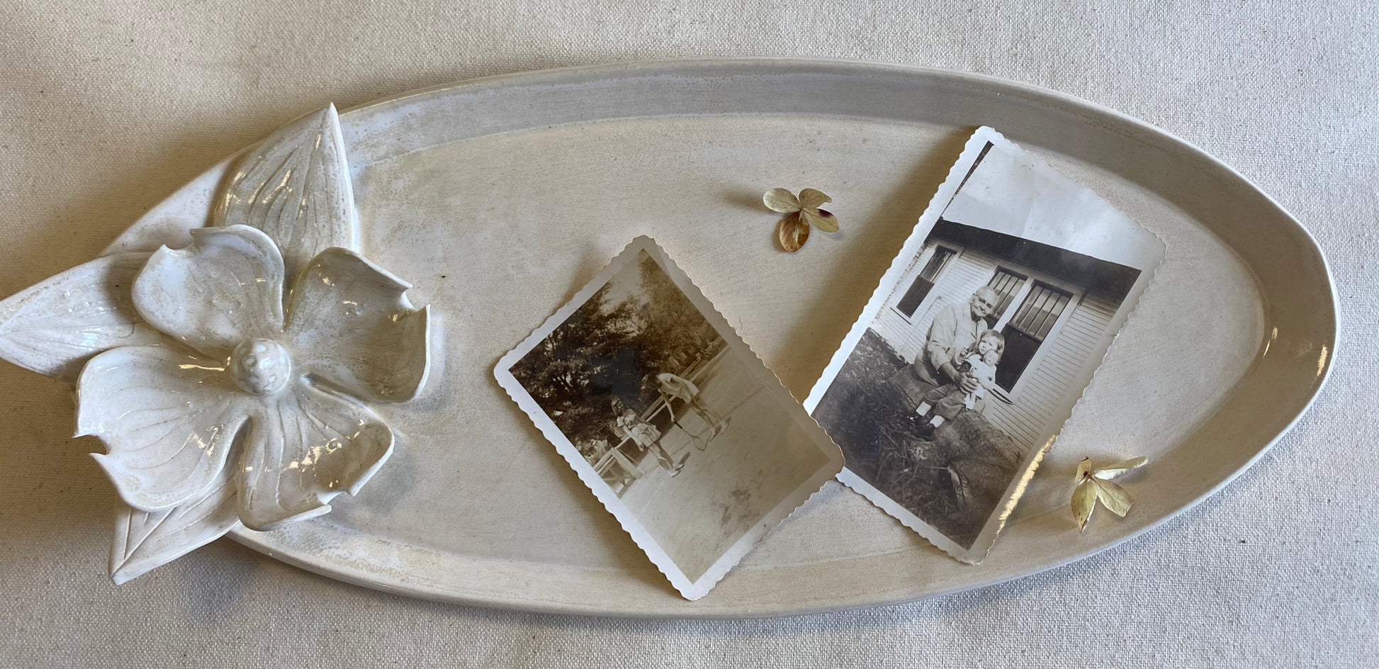 This beautiful large oval platter is adorned with a hand sculpted dogwood in the corner. It's glazed in my signature bone colored glaze. This platter is durable enough for everyday use and can be washed by hand.