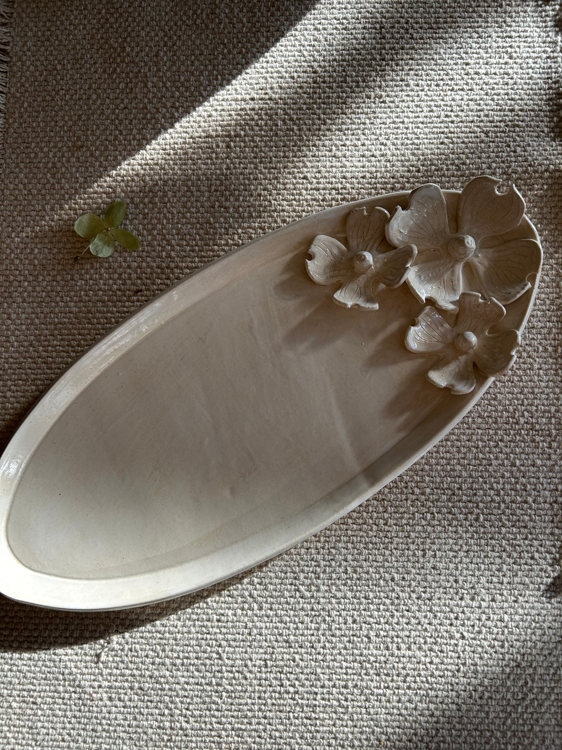 Glazed in a creamy white, this beautiful platter is adorned with three hand formed dogwood blooms. The triple dogwood platter is durable enough to be used as a serving piece with a food safe glaze making it the perfect piece to use during your most festive get togethers while being subtle enough to be a part of your daily use.